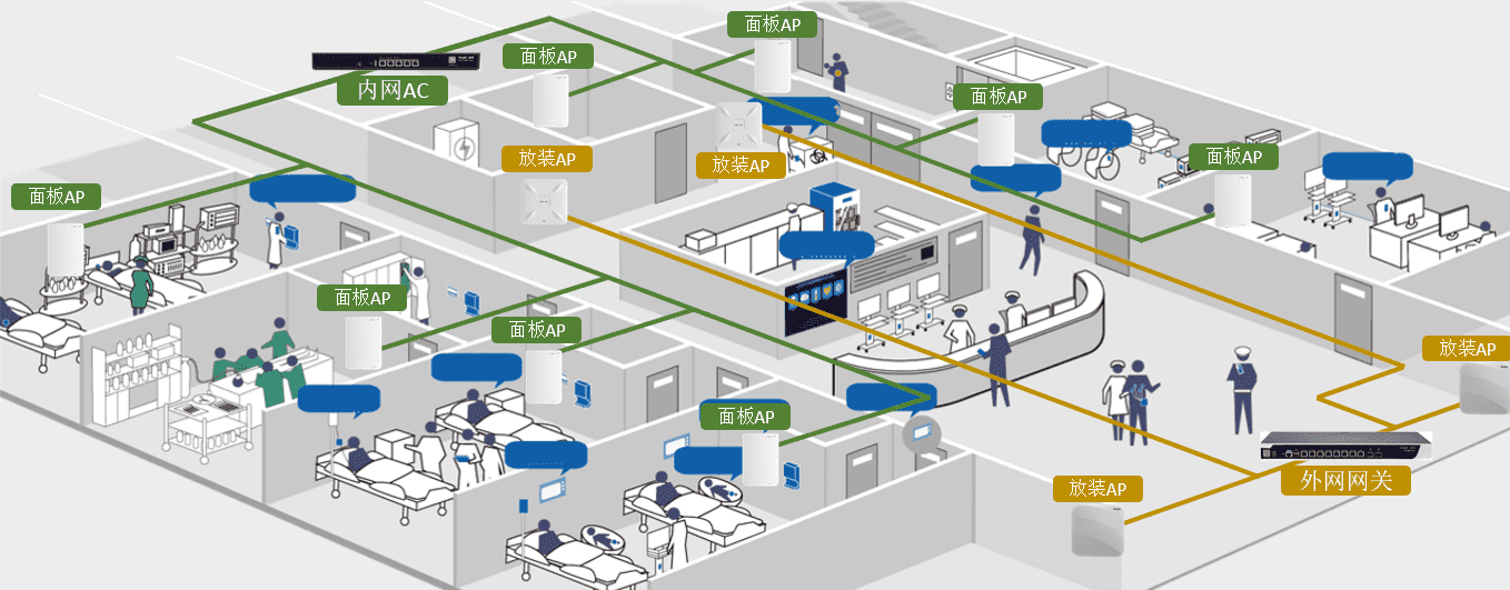 快速部署需求方艙醫(yī)院建設(shè)以速度快為主要特點(diǎn),應(yīng)保證供應(yīng)快、實(shí)施快,不能讓網(wǎng)絡(luò)實(shí)施拖了整體建設(shè)的后腿。無(wú)線接入質(zhì)量需求Internet出口應(yīng)滿足方艙醫(yī)院的醫(yī)患容量;如何保障在有限帶寬下,讓每個(gè)人都擁有公平網(wǎng)絡(luò)流量?如何應(yīng)對(duì)一些視頻類,大流量用戶問(wèn)題?醫(yī)護(hù)人員和患者使用的手機(jī)品牌及價(jià)格不同,導(dǎo)致了具備的接入能力不同,如何為高中低端手機(jī)提供穩(wěn)定的WiFi接入更為關(guān)鍵;最后,要保障醫(yī)護(hù)人員和患者在移動(dòng)過(guò)程使用WiFi的良好上網(wǎng)體驗(yàn)?;A(chǔ)設(shè)施齊全需求方艙醫(yī)院網(wǎng)絡(luò)基礎(chǔ)系統(tǒng)設(shè)施應(yīng)該齊備,保證內(nèi)網(wǎng)業(yè)務(wù)正常運(yùn)轉(zhuǎn)及患者基本所需,不應(yīng)出現(xiàn)缺失設(shè)備情況,投入使用后難以補(bǔ)救,造成損失。安全隔離管理需求投入使用之后的方艙醫(yī)院,尤其是污染區(qū)的隔離病房,屬于高危區(qū)域,一旦設(shè)備出現(xiàn)故障,運(yùn)維人員一般很難到達(dá)現(xiàn)場(chǎng)進(jìn)行維護(hù),因此,網(wǎng)絡(luò)設(shè)備應(yīng)支持授權(quán)遠(yuǎn)程運(yùn)維的功能,保障運(yùn)維人員對(duì)內(nèi)網(wǎng)設(shè)備進(jìn)行遠(yuǎn)程維護(hù)、升級(jí)。監(jiān)控承載需求監(jiān)控承載方艙內(nèi)外的安全任務(wù),方艙醫(yī)院內(nèi)有大量監(jiān)控點(diǎn)位,對(duì)網(wǎng)絡(luò)的大流量承載能力提出需求。同時(shí),監(jiān)控點(diǎn)位的部署還要考慮醫(yī)患的隱私。