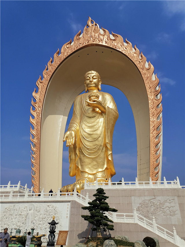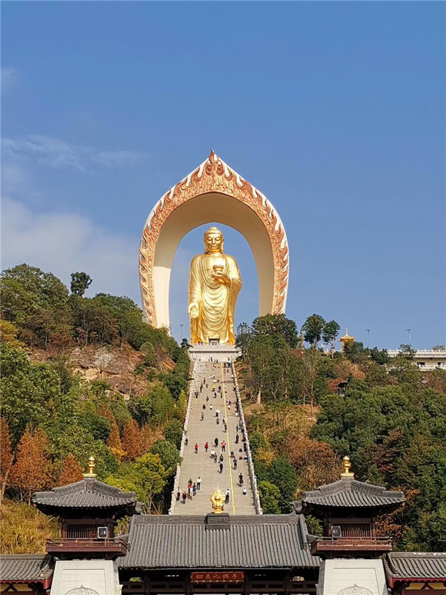 金秋的陽光溫馨恬靜,金秋的微風和煦輕柔,金秋的藍天白云飄逸,金秋的田野遍地金黃。團建第三天,我們來到了九江星子縣瞻仰世界最高48米大佛--東林大佛。經(jīng)了解,大佛北依廬山主峰,群山環(huán)抱,山水相連,彌陀壇城,凈宗道場,朝圣勝地,是一方集朝圣、修行、弘法、教育、慈善為一體的凈土。高度48米,以表阿彌陀佛發(fā)的四十八大愿??偢?1米,為至火焰寶蓋頂點之距,81米,以表九九八十一,意為修行成佛艱辛不易。在阿彌陀佛像里面,是中國及全球第一高的。我們帶著無比虔誠的心瞻仰著。此刻的心靈,猶如明鏡一般清澈、透明,遠離塵囂!